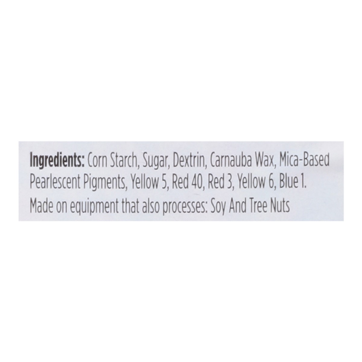 Corn Starch, Sugar, Dextrin, Carnauba Wax, Mica-Based Pearlescent Pigments, Yellow 5, Red 40, Red 3, Yellow 6, Blue 1.