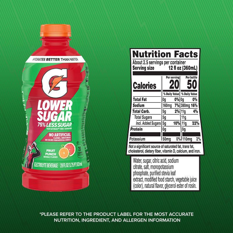 - Includes 1(28 fl oz) bottle of Gatorade Lower Sugar Electrolyte Sports Drink made with 75% lower sugar than regular Gatorade, Fruit Punch flavor