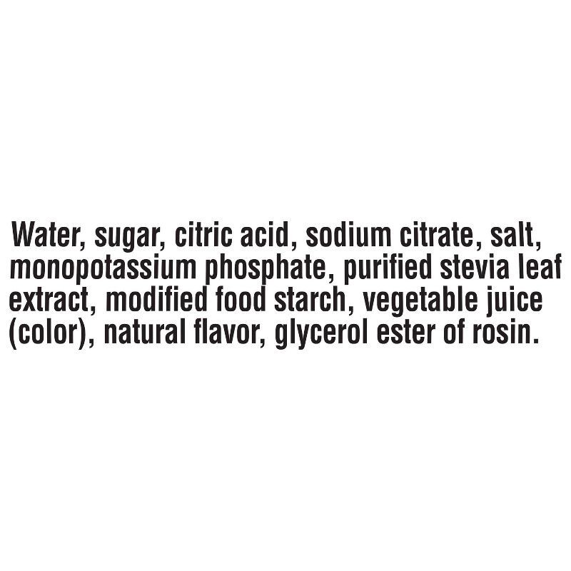 Water, Sugar, Citric Acid, Sodium Citrate, Salt, Monopotassium Phosphate, Purified Stevia Leaf Extract, Modified Food Starch, Vegetable Juice (Color), Natural Flavor, Glycerol Ester Of Rosin.
