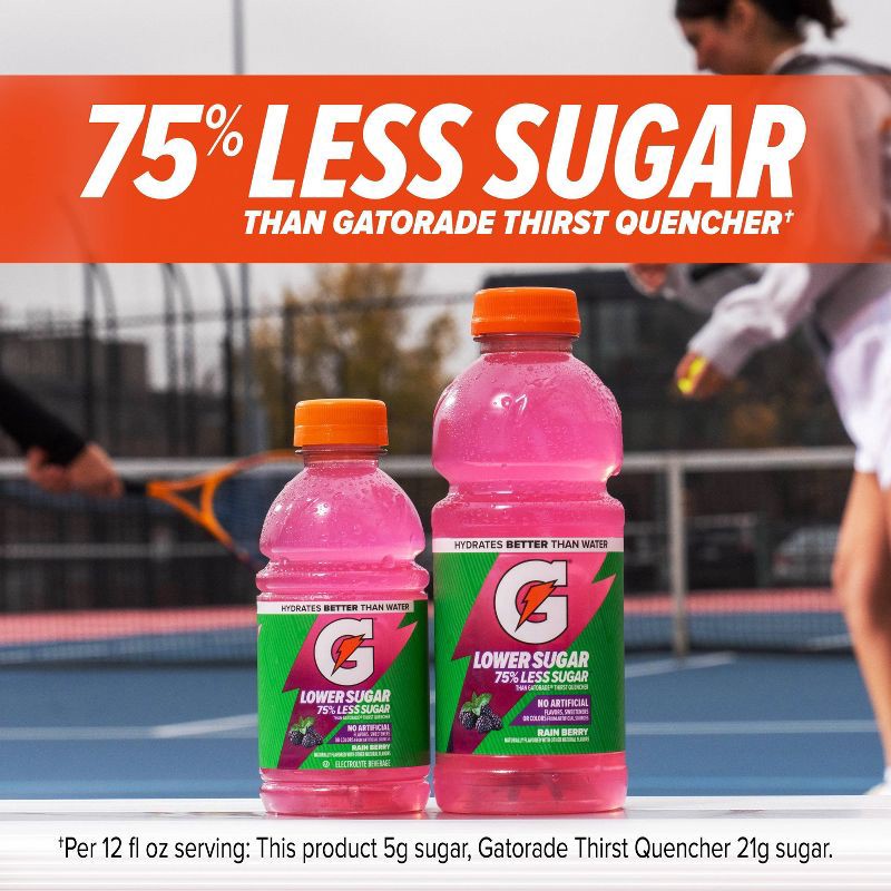 - Lower Sugar Gatorade: Gatorade Lower Sugar contains 75% less sugar* than Gatorade Thirst Quencher and contains no artificial flavors, sweeteners or colors (*Per 12 fl. oz serving: This product 5g sugar, Gatorade Thirst Quencher 21g sugar).