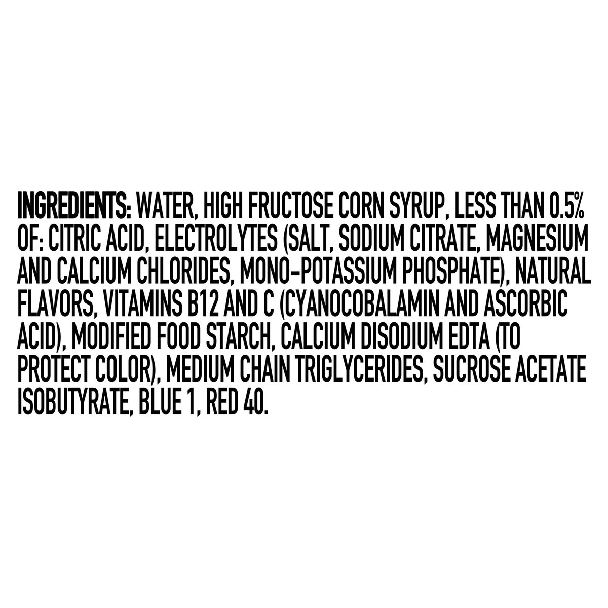 Water\, High Fructose Corn Syrup\, Less than 0.5% of: Citric Acid\, Electrolytes (Salt\, Sodium Citrate\, Magnesium and Calcium Chlorides\, Mono-Potassium Phosphate)\, Natural Flavors\, Vitamins B12 a…