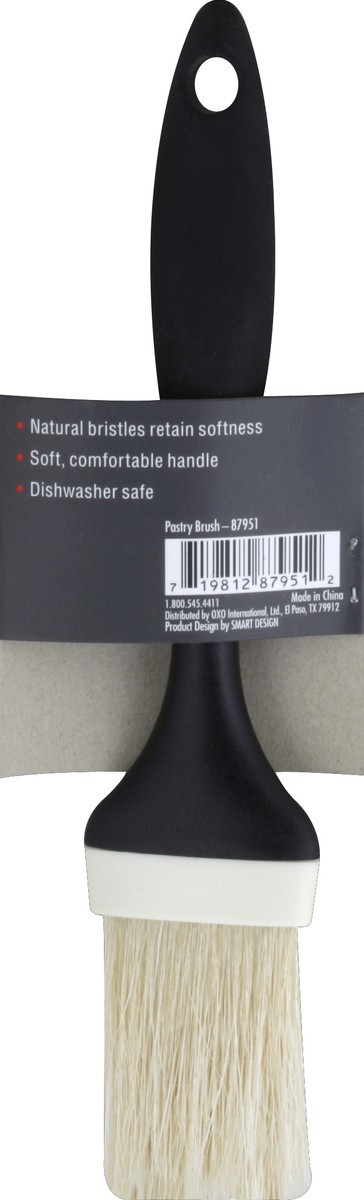 Natural bristles retain softness. Soft\, comfortable handle. Dishwasher safe. Satisfaction guaranteed. www.oxo.com. Product design by Smart Design. Made in China.