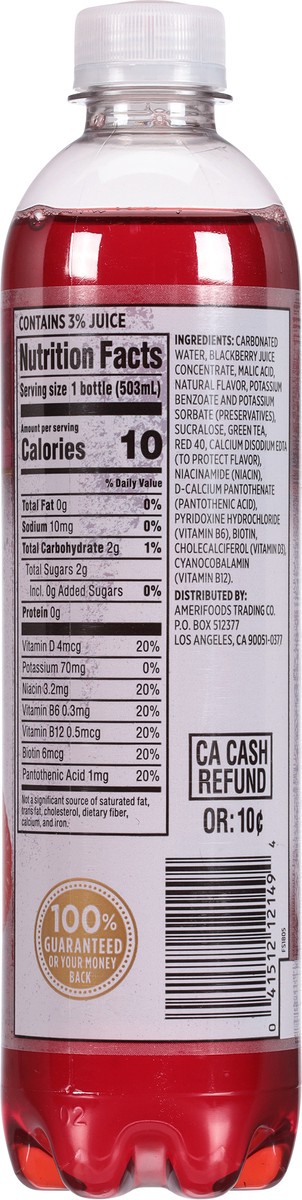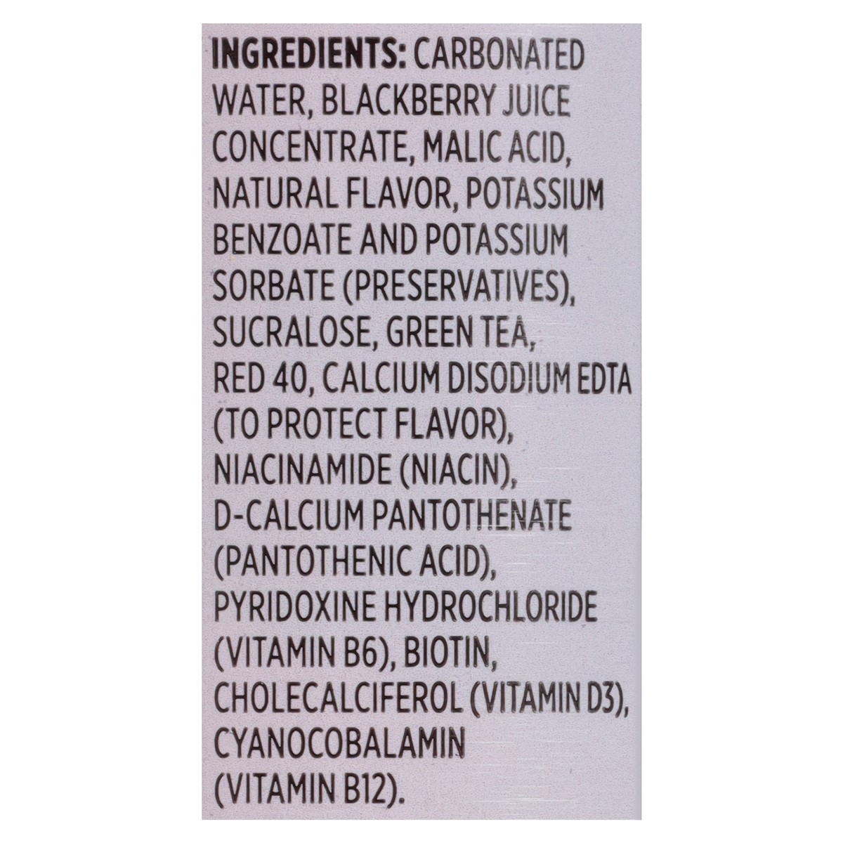 Carbonated Water, Blackberry Juice Concentrate, Malic Acid, Natural Flavor, Potassium Benzoate and Potassium Sorbate (Preservatives), Sucralose, Green Tea, Red 40, Calcium Disodium EDTA (to Protect Fl…