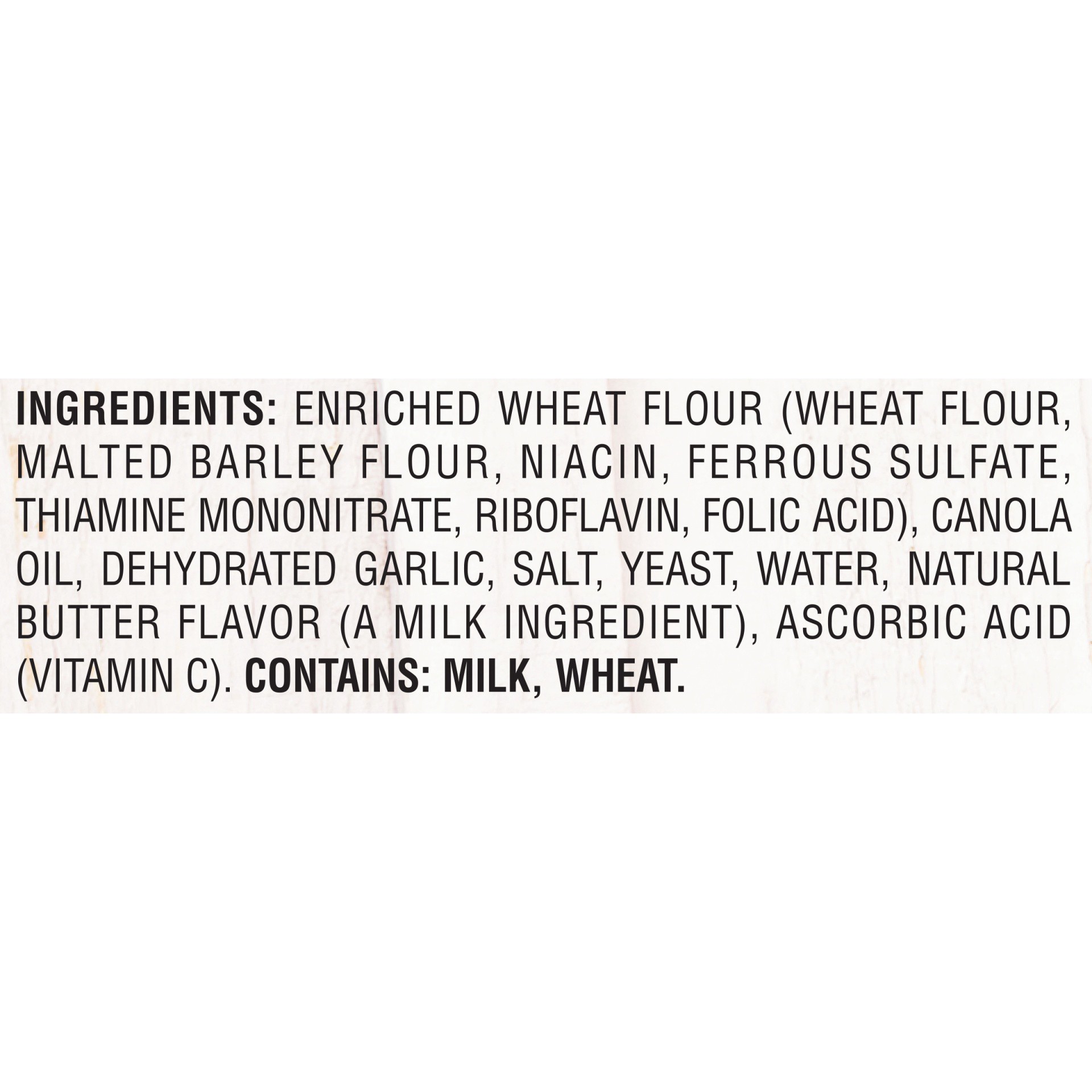 Ingredients: Enriched Wheat Flour (wheat Flour, Malted Barley Flour, Niacin, Ferrous Sulfate, Thiamine Mononitrate, Riboflavin, Folic Acid), Canola Oil, Dehydrated Garlic, Salt, Yeast, Water, Natural …