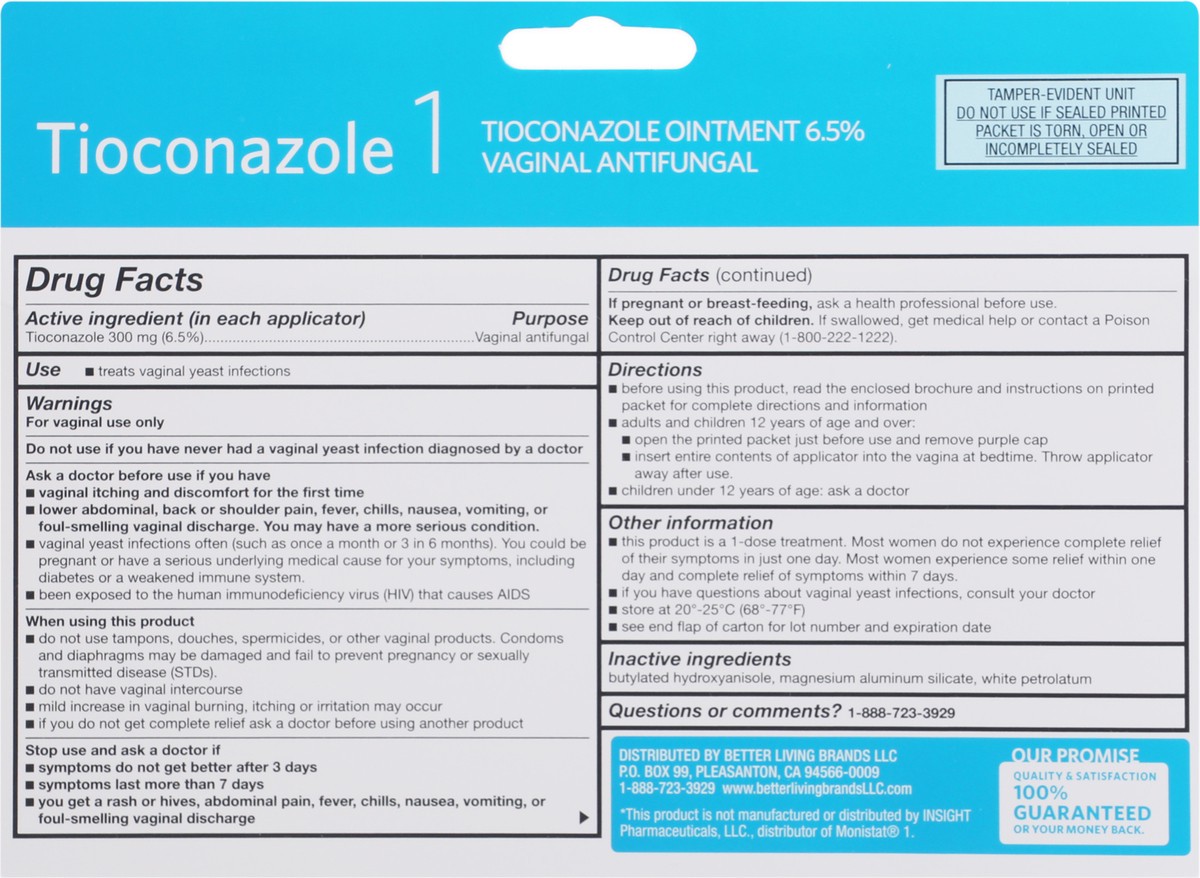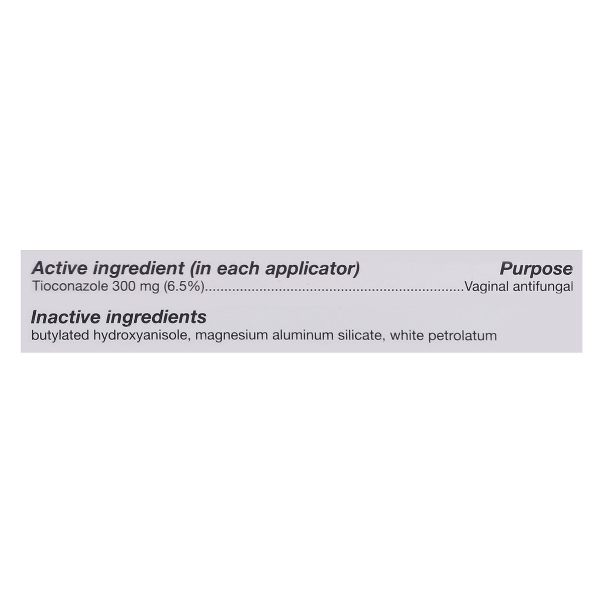 (In Each Applicator) Active Ingredients: Tioconazole (6.5%) (300 mg), Vaginal antifungal. Inactive Ingredients: Butylated Hydroxyanisole, Magnesium Aluminum Silicate, White Petrolatum.