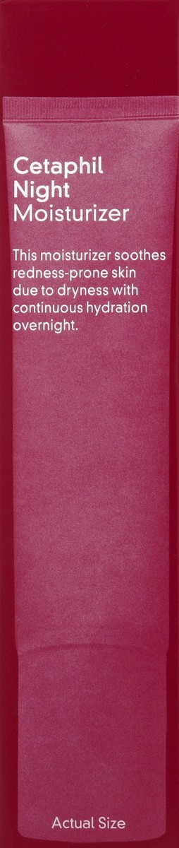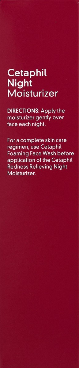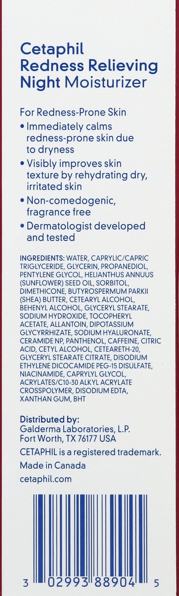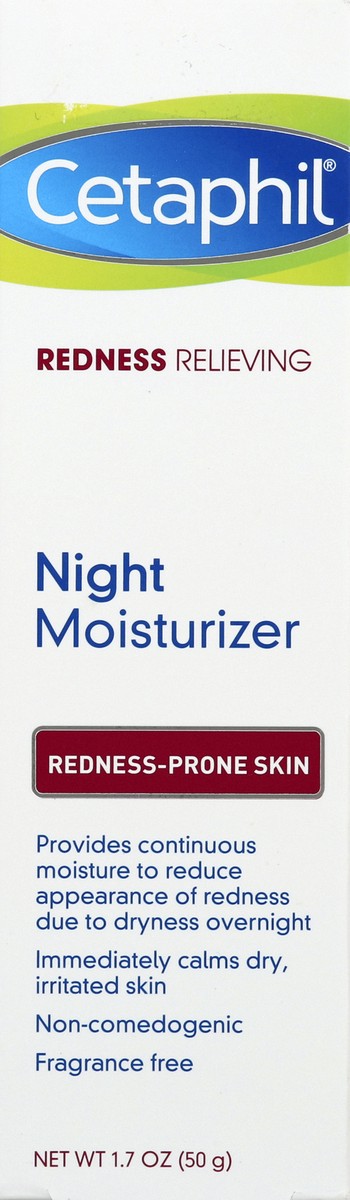 - CETAPHIL REDNESS RELIEVING NIGHT MOISTURIZER: Specially formulated for redness-prone skin to provide continuous hydration that helps reduce the appearance of redness due to dryness overnight