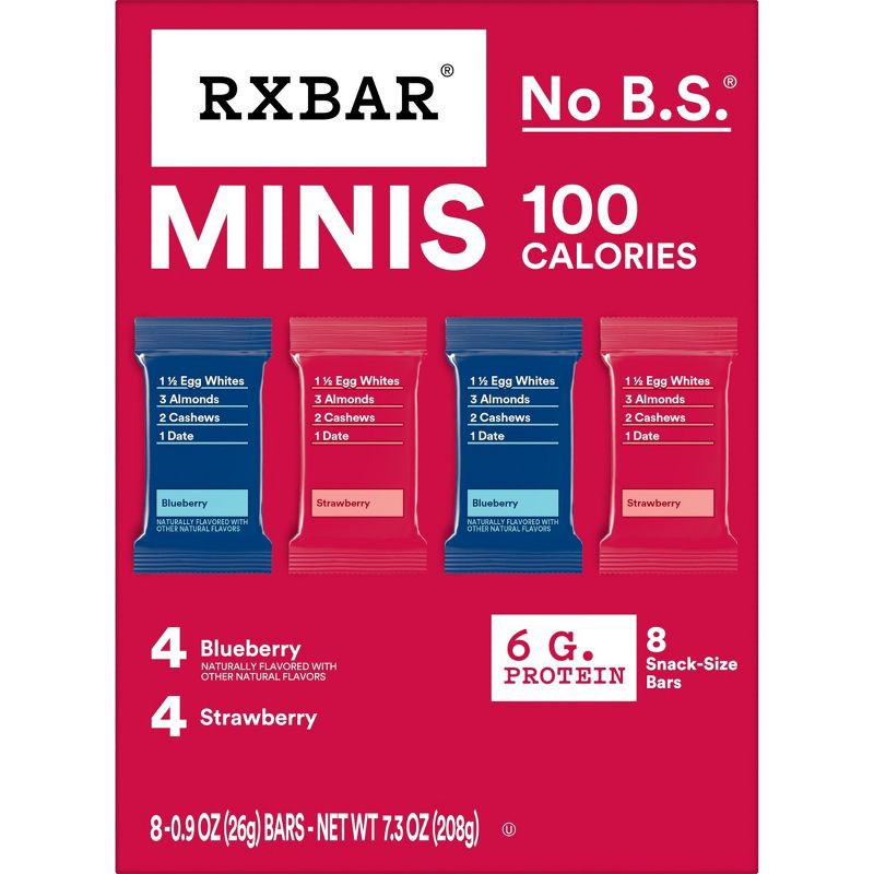 - Mini protein bars made with simple ingredients; 100 calories per serving; Includes RXBAR Strawberry and RXBAR Blueberry