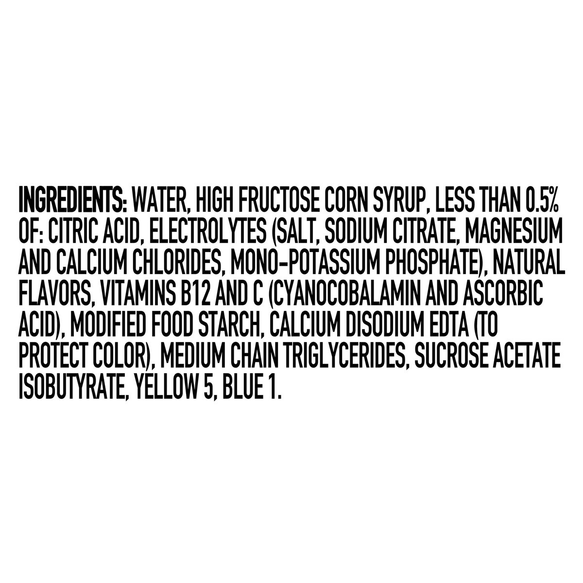 Water, High Fructose Corn Syrup, Less than 0.5% of: Citric Acid, Electrolytes (Salt, Sodium Citrate, Magnesium and Calcium Chlorides, Mono-Potassium Phosphate), Natural Flavors, Vitamins B12 and C (Cy…