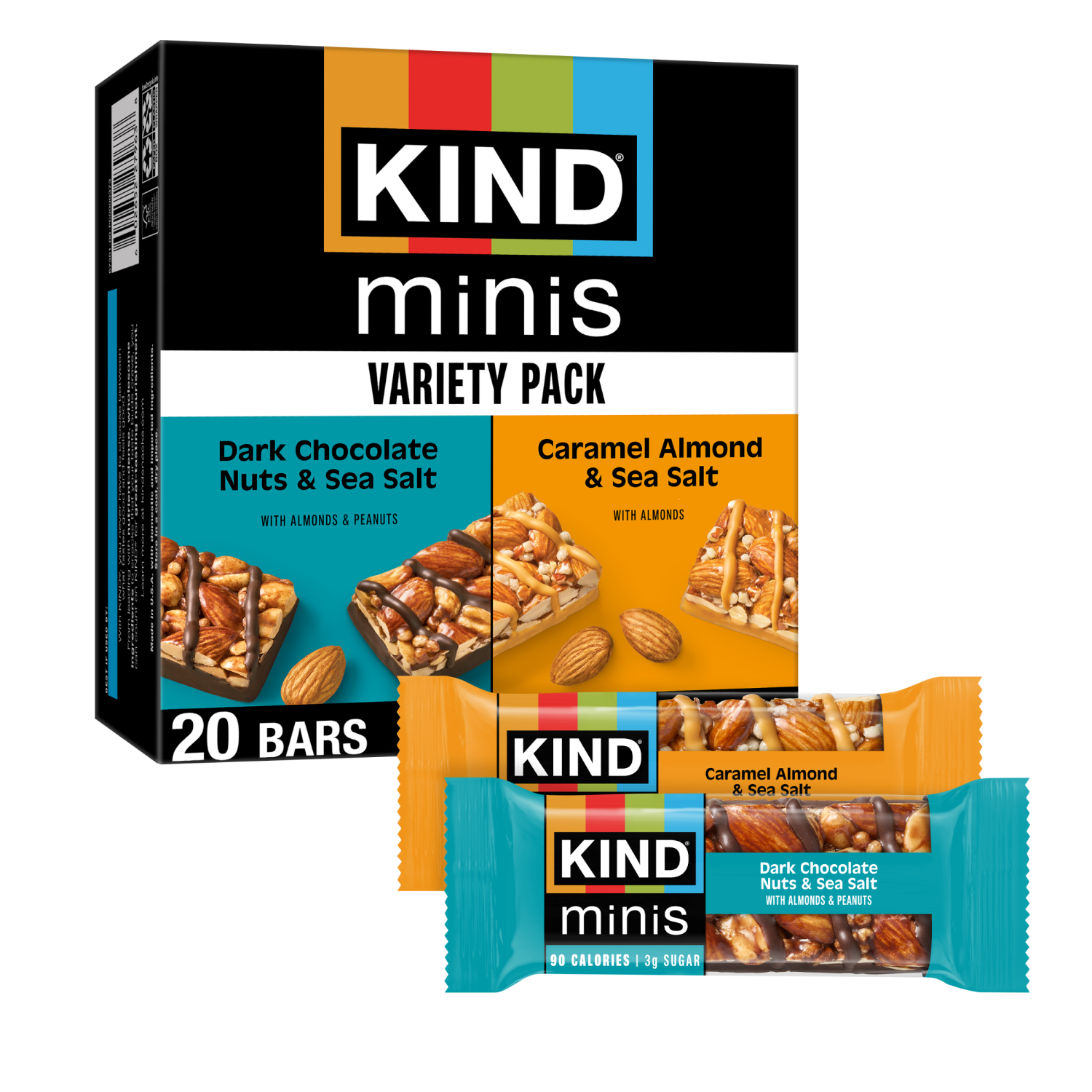 KIND Minis Dark Chocolate Nuts & Sea Salt and Caramel Almond & Sea Salt bars snack variety pack offers bite-sized versions of classic KIND flavors. The two flavors in this KIND Minis variety pack lead…