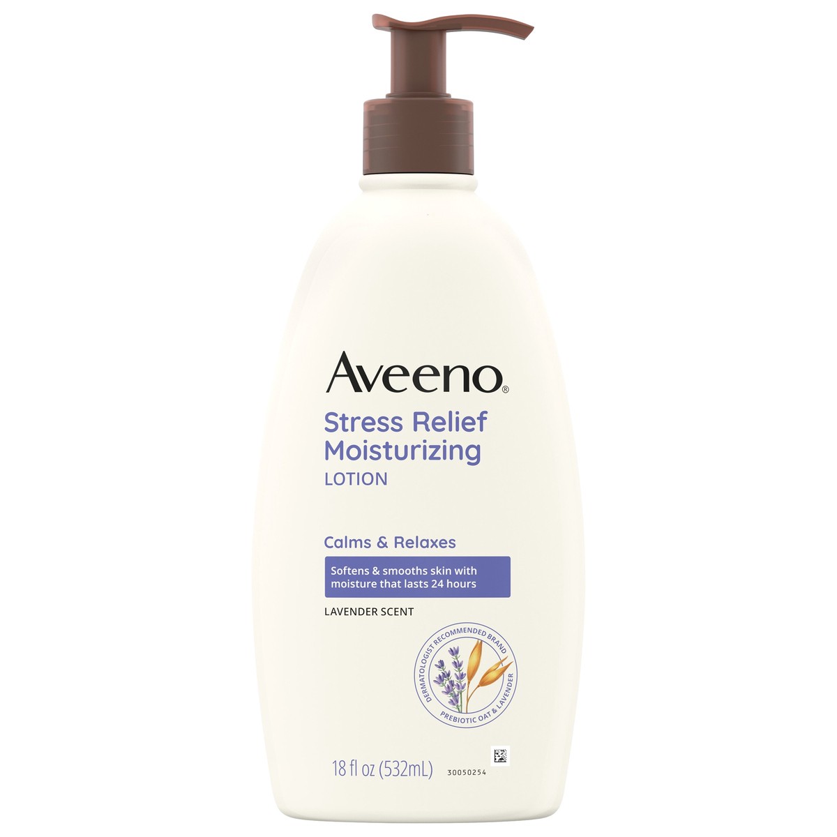 - 18-fluid ounces of Aveeno Stress Relief Moisturizing Body Lotion with lavender scent relaxes you while providing your skin with 24 hours of intense moisture. The unique formula includes oatmeal, an ingredient known for its skin-soothing properties