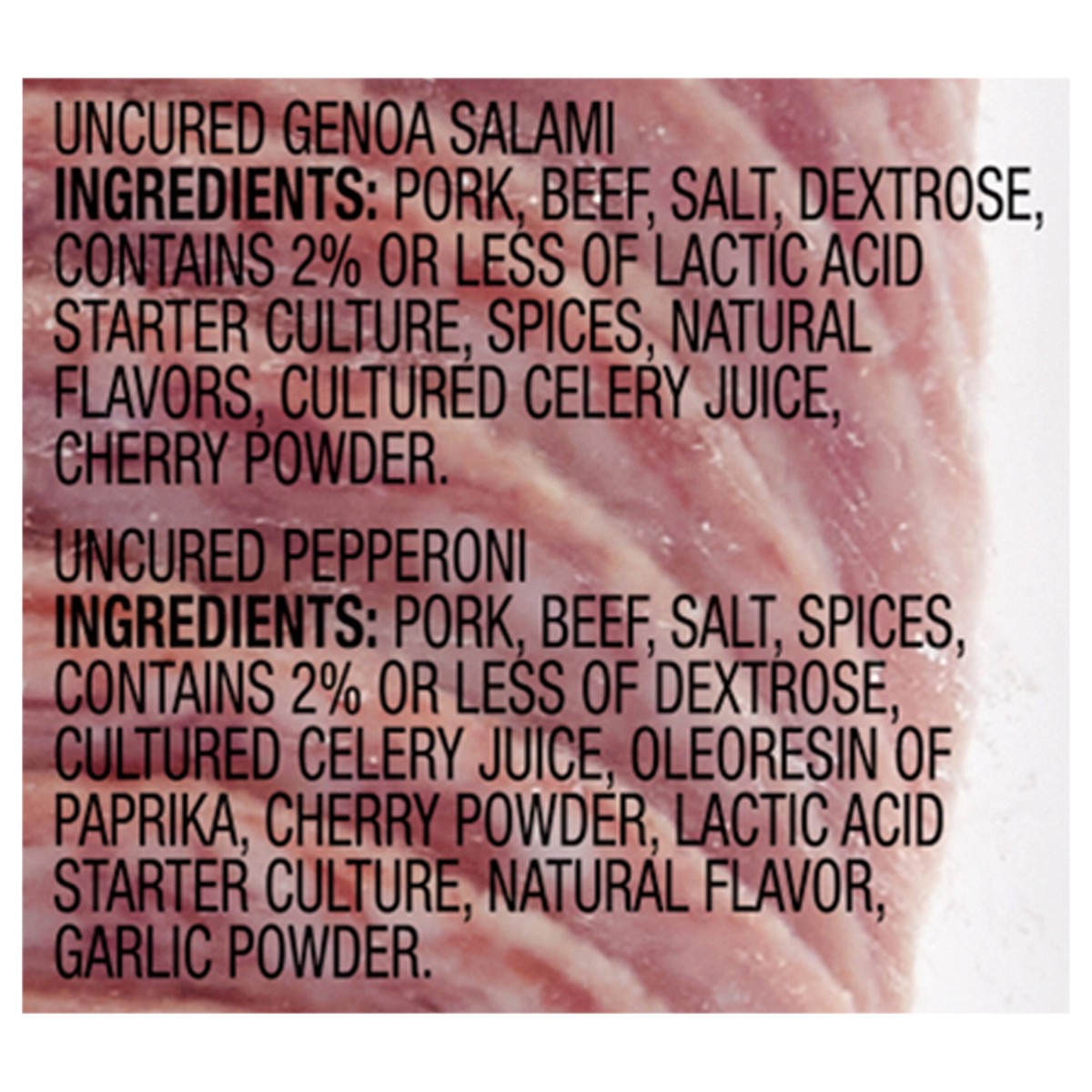 Uncured Genoa Salami: Pork, Beef, Salt, Dextrose, Contains 2% or Less of Lactic Acid Starter Culture, Spices, Natural Flavors, Cultured Celery Juice, Cherry Powder. Uncured Pepperoni: Pork, Beef, Salt…