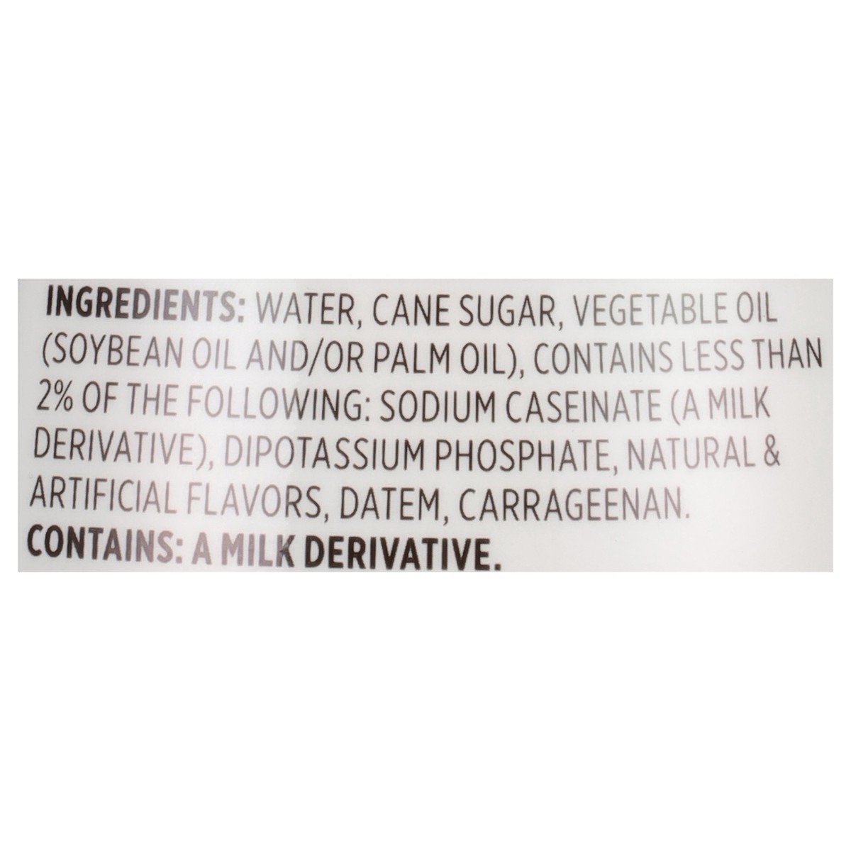 Water, Cane Sugar, Vegetable Oil (Soybean Oil and/or Palm Oil), Contains Less than 2% of the Following: Sodium Caseinate (a Milk Derivative), Dipotassium Phosphate, Natural & Artificial Flavors, DATEM…