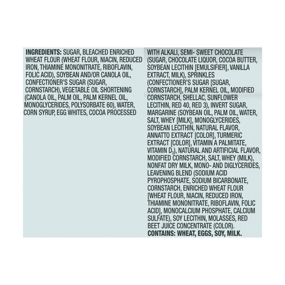 Sugar, Bleached Enriched Wheat Flour (Wheat Flour, Niacin, Reduced Iron, Thiamine Mononitrate, Riboflavin, Folic Acid), Soybean And/Or Canola Oil, Icing Sugar (Sugar, Cornstarch), Vegetable Oil Shorte…