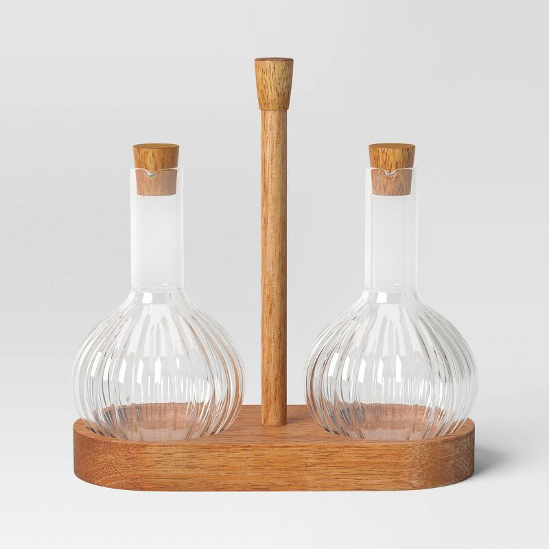Bring an element of rustic charm to your table or kitchen countertop with this Oil and Vinegar with Wood Caddy from Threshold™. This set includes two glass bottles featuring spherical bodies with a fl…