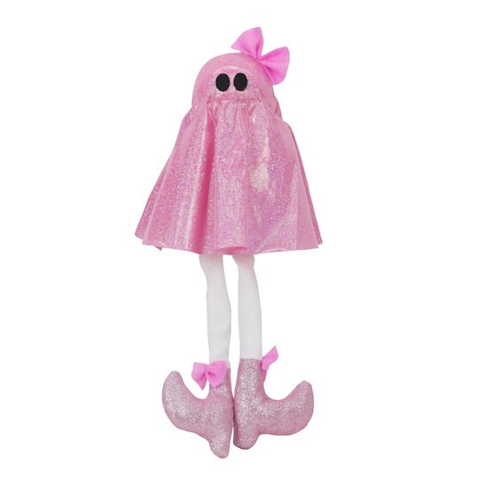 Find the 13" Iridescent Fabric Ghost Tabletop Sitter by Ashland at Michaels. All done up with a pink bow, this friendly spirit features a shimmery fabric body and dangle legs with matching witchy shoe…