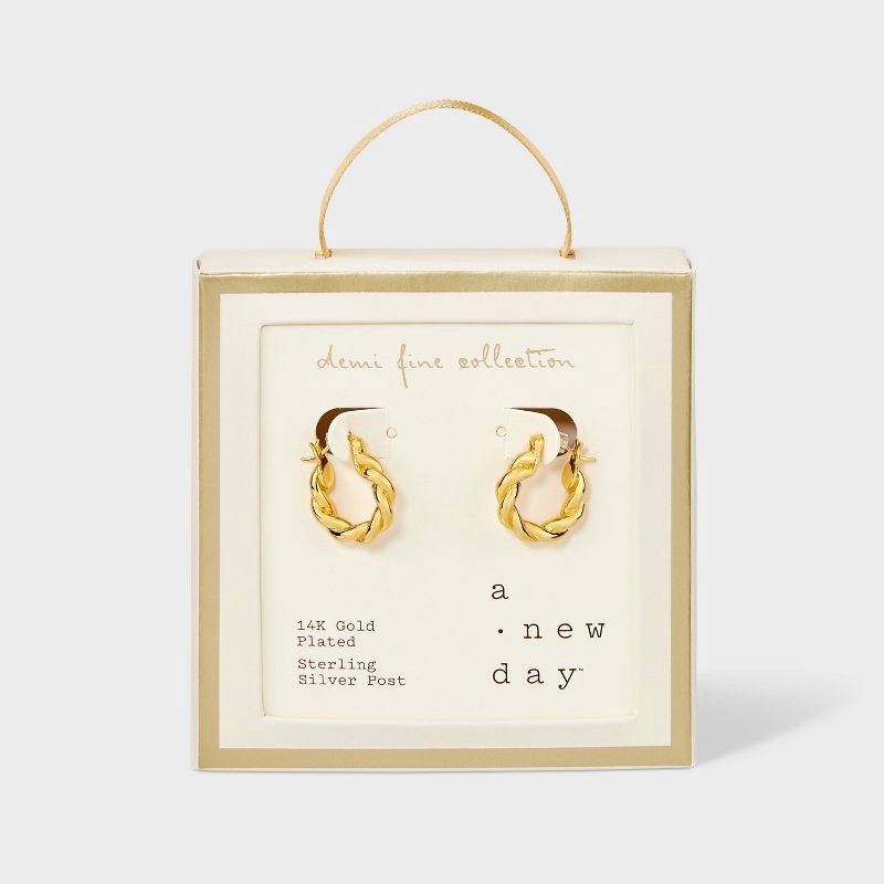 Add a touch of elegance to your everyday looks with the 14K Gold Plated Brass Polished Twist Click Top Hoop Earrings from A New Day™. These 14K gold-plated hoop earrings feature a cool twisted design …