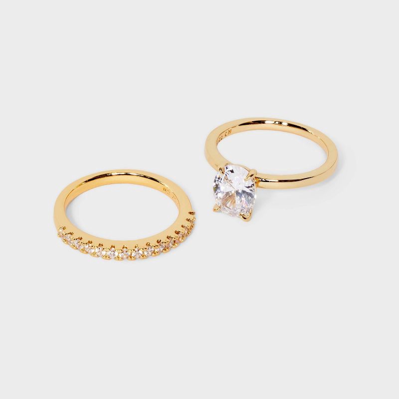 Flaunt your couple goals with the 14K Gold-Plated Oval Cubic Zirconia and Pave Band Wedding Ring Set from A New Day™. This two-piece wedding ring set includes cubic zirconia accented oval and pave rin…
