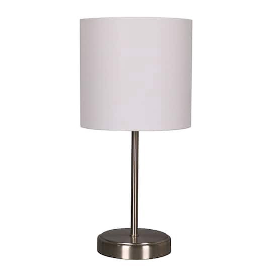 Find the 15" Silver Metal Table Lamp with White Fabric Shade by Ashland at Michaels. With a slender silver stick base finished with a cylindrical fabric shade, this piece will be a lovely complement t…