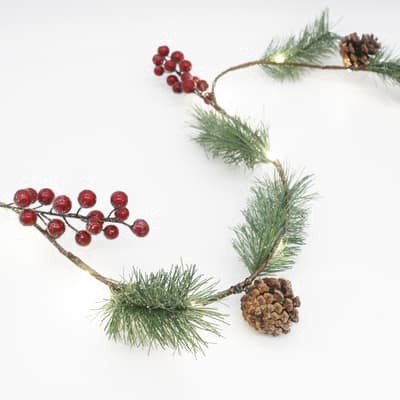 15ct. Warm White Led Iced Pine & Red Berry Garland String Lights On Brown Wire By Ashland