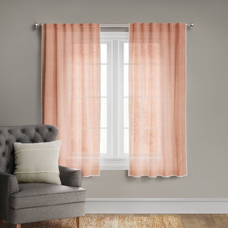 Let soft light into your room with this Stitched-Edge Light-Filtering Curtain Panel from Threshold™. The soft fabric-blend drapery panel in a solid color with contrast decorative stitching along the e…