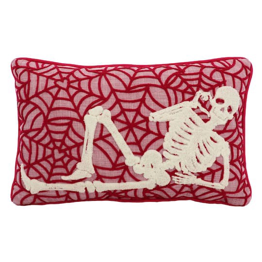 Buy the 20" x 12" Skeleton with Web Lumbar Pillow by Ashland at Michaels. Featuring a skeleton posing over a red spiderweb, this accent will be a spooky addition to your couch, loveseat or bed this Ha…