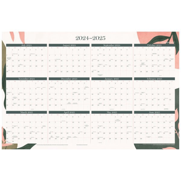 2024-2025 Cambridge Haven Reversible Academic Year/Regular Year Erasable Wall Calendar, 24"" X 36"", Floral, July To June