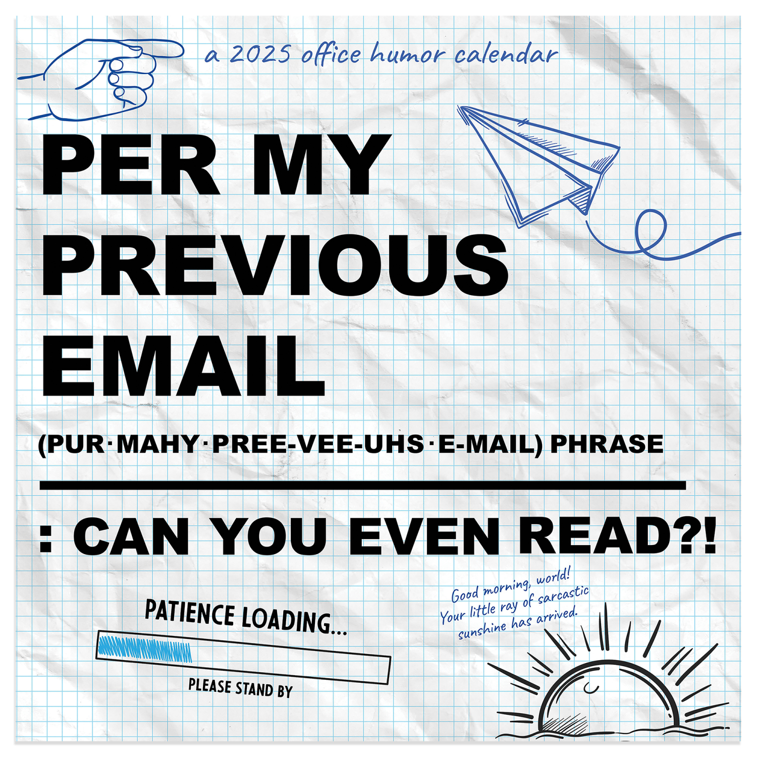 Office passive aggression at its finest! Our hilarious 2025 12-month Per My Last Email mini wall calendar measures 7" x 7" (7" x 14" open) and features thirteen perfecty passive aggressive sayings tha…