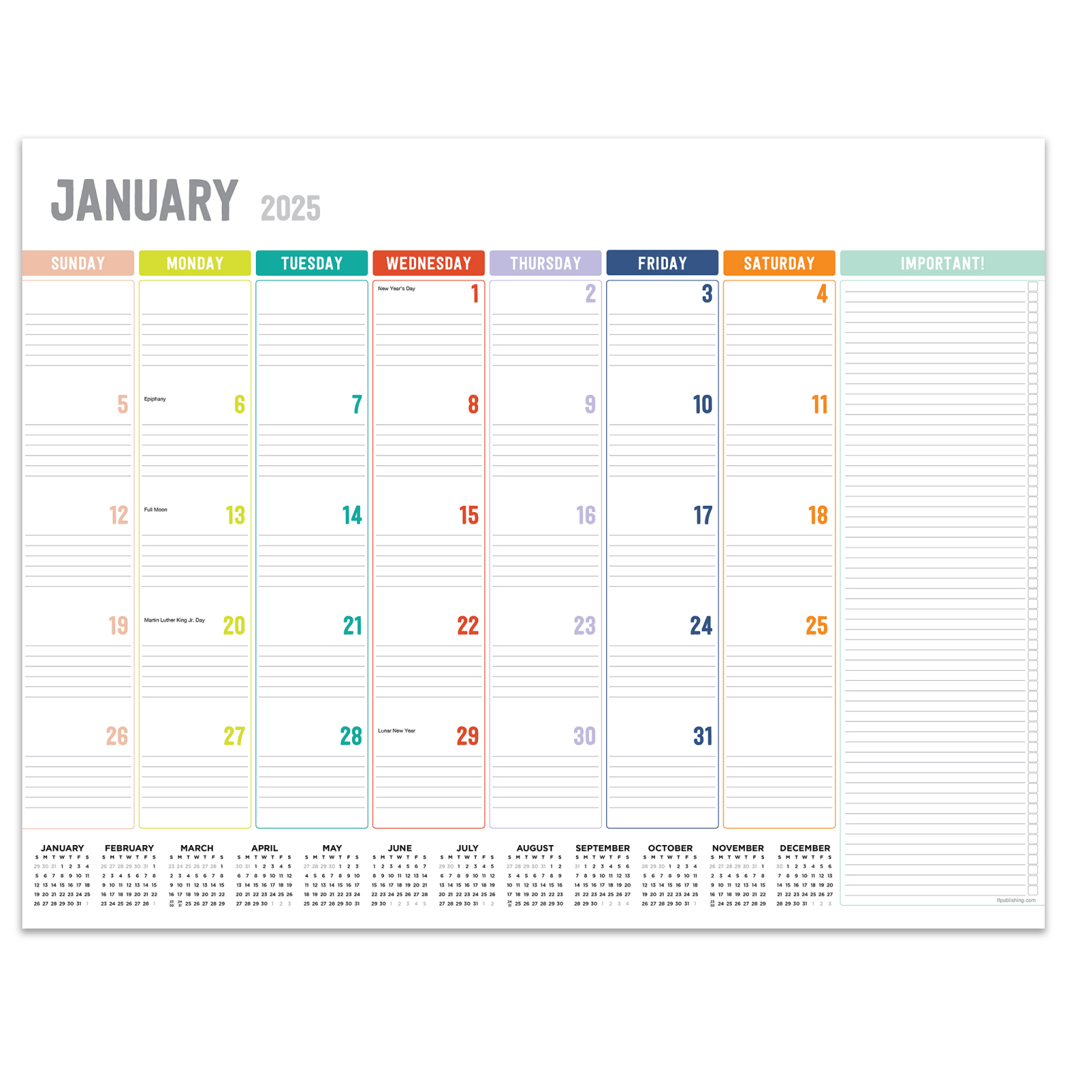 Radiate positivity! With a colorful yet structured design, organizing your year just got brighter and easier with our rainbow 12-month desk pad calendar! The monthly tear-off pages have the days of th…