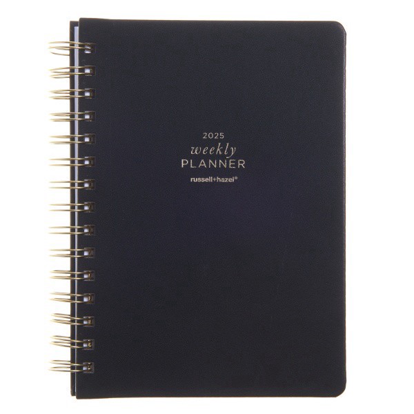 Keep track of your day-to-day with the 2025 Russell & Hazel Weekly/Monthly Spiral Vegan Leather Planner. The weekly/monthly spreads provide ample space for writing down events, while the yearly goal t…