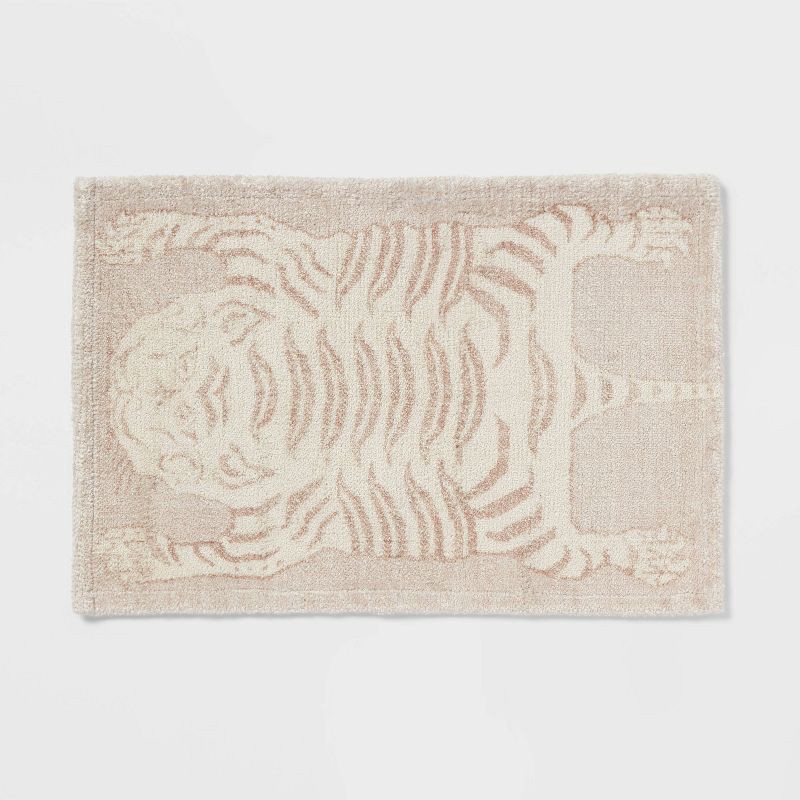 Give your bath space a ferocious update with this Tiger Print Bath Rug from Threshold™. This rectangular bath rug features tiger print in a tan hue for an eye-catching look that blends well with a var…