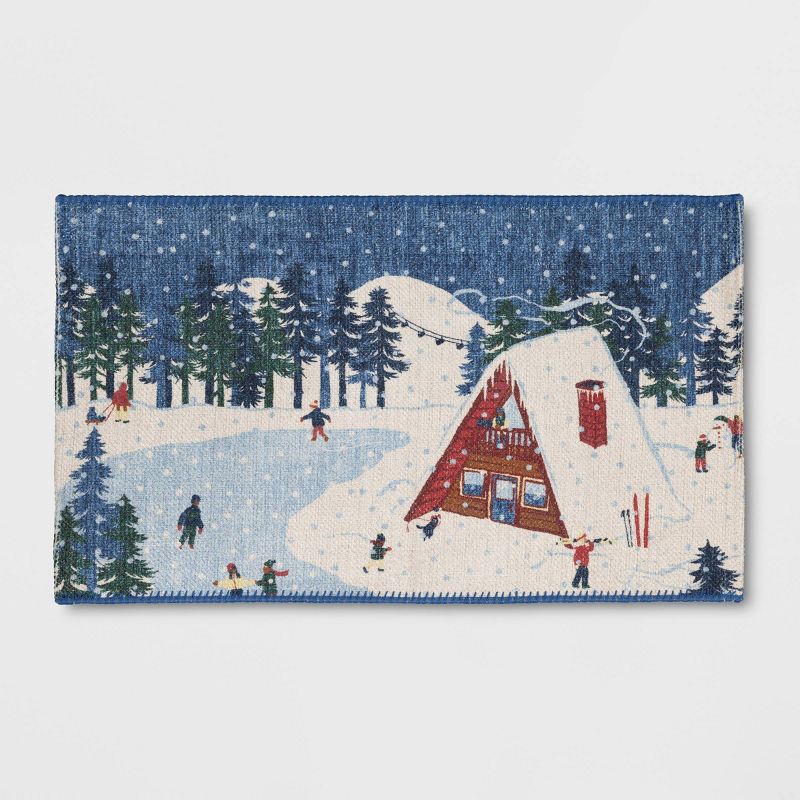 This 20-Inch x 34-Inch Winter Skiing and Skating with Chalet Scatter Rug from Room Essentials™ brings classic winter charm into your home. Made from polyester fabric, this scatter rug showcases a snow…