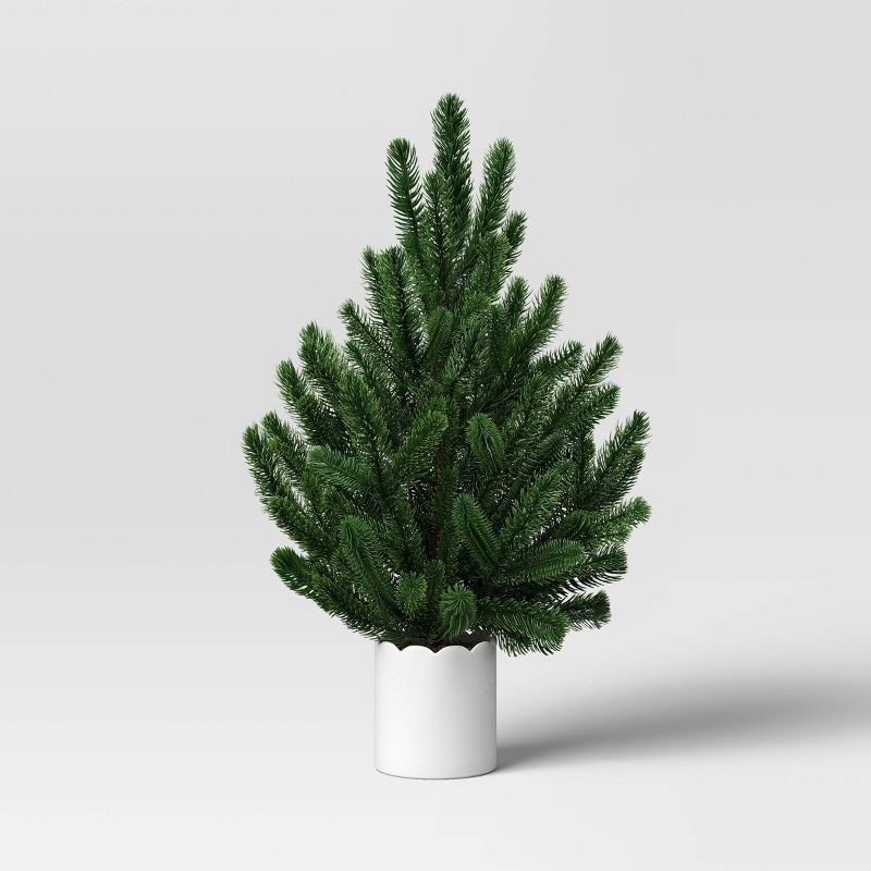 This Classic Christmas Artificial Tree from Threshold™ brings a touch of holiday cheer to your home. This artificial tree showcases faux pine branches in a rich green hue placed in a textured white po…