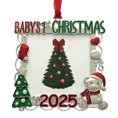 Buy the 2.25" x 2.25" Silver, Red & Green Baby's 1st Christmas 2025 Ornament Frame by Studio Decor at Michaels. Featuring a silver frame with the text " Baby's 1st Christmas 2025" and holiday icon acc…