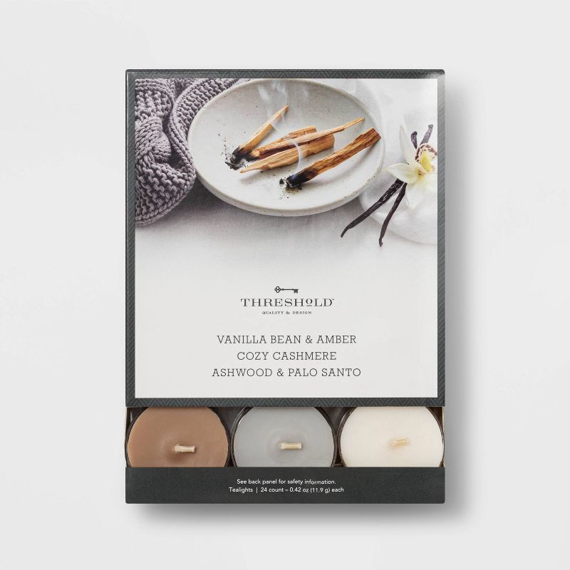 24pk Tealight Vanilla Bean and Amber/Cozy Cashmere/Ashwood Candle - Threshold™: Palm Oil & Paraffin Wax, 4hr Burn Time