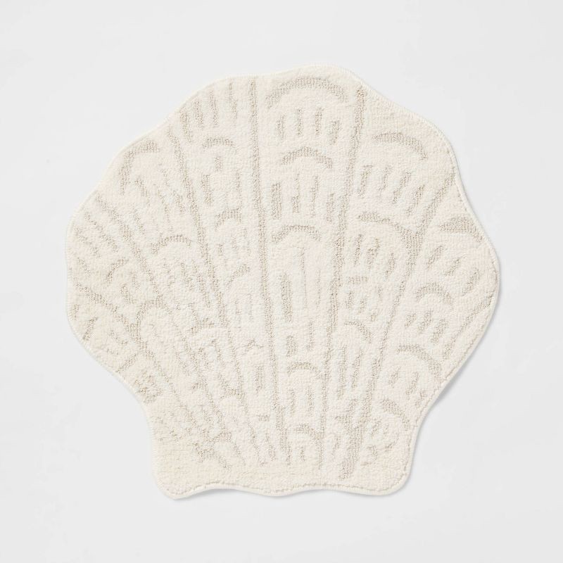 Infuse your bathroom decor with the ocean-inspired charm of this Seashell-Shaped Coastal Non-Skid Bath Rug from Threshold™. This midweight bath rug is designed in a seashell shape with knitted cream s…