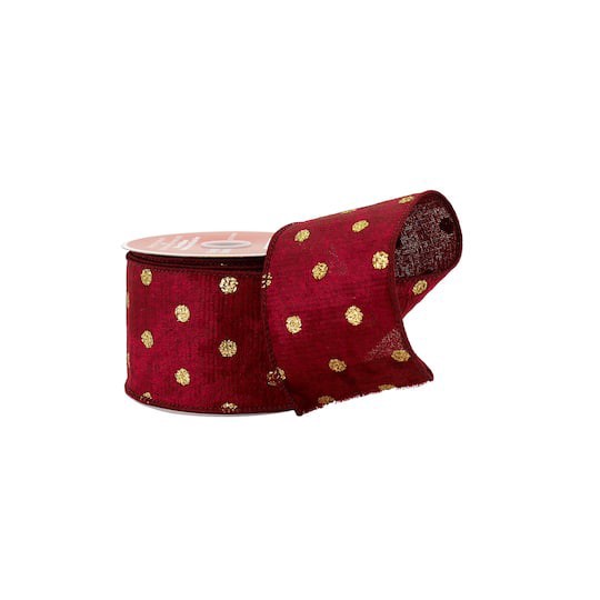 Find this 2.5" x 20ft. Burgundy & Gold Dots Wired Ribbon by Celebrate It at Michaels. The deep red Christmas ribbon has a metallic gold polka dots pattern, and the wired edges are perfect for adding s…