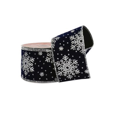 2.5" X 20ft. Navy & Silver Snowflake Wired Velvet Ribbon By Celebrate It
