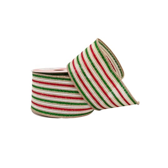 Purchase this 2.5" x 20ft. Red, Green & White Stripes Wired Ribbon by Celebrate It at Michaels. The classic Christmas ribbon has red and green glitter and white print stripes on a neutral base, and th…