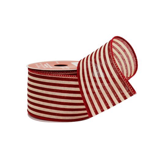 Find this 2.5" x 20ft. Red Ticking Stripes Wired Ribbon by Celebrate It at Michaels. The traditional Christmas ribbon has a red and white stripes pattern, and the wired edges are perfect for adding st…