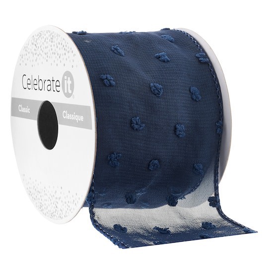 2.5" X 3yd. Wired Navy Pom Pom Dotted Crinkle Chiffon Ribbon By Celebrate It