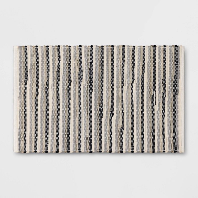 Add timeless style to your floor with this Handloom Woven Accent Rug from Room Essentials™. The handmade accent rug is adorned with neutral-color stripes in black, gray, olive green and cream hues, ad…