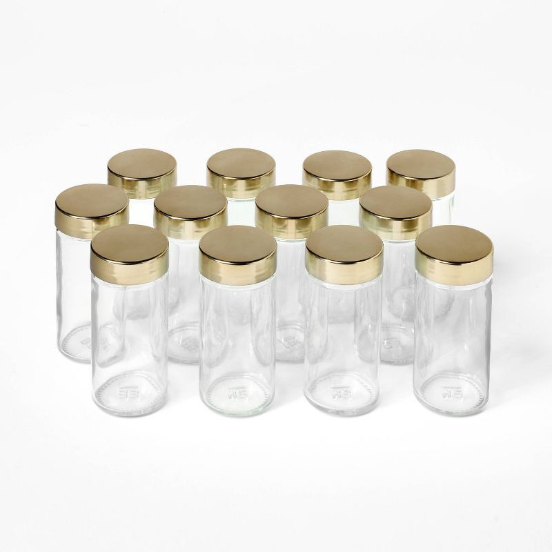 Keep all your essential spices neatly organized with this 24-Piece Glass Spice Jar Set from Figmint™. Made from clear glass with champagne gold plastic lids, this set includes 24 spice jars, each stan…