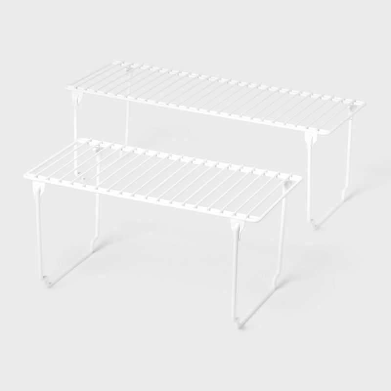 Maximize your storage space with this 2-Piece Foldable Legs Metal Wire Helper Shelf Set from Brightroom™. The set includes two white helper shelves with open-wire rack design and convenient foldable l…