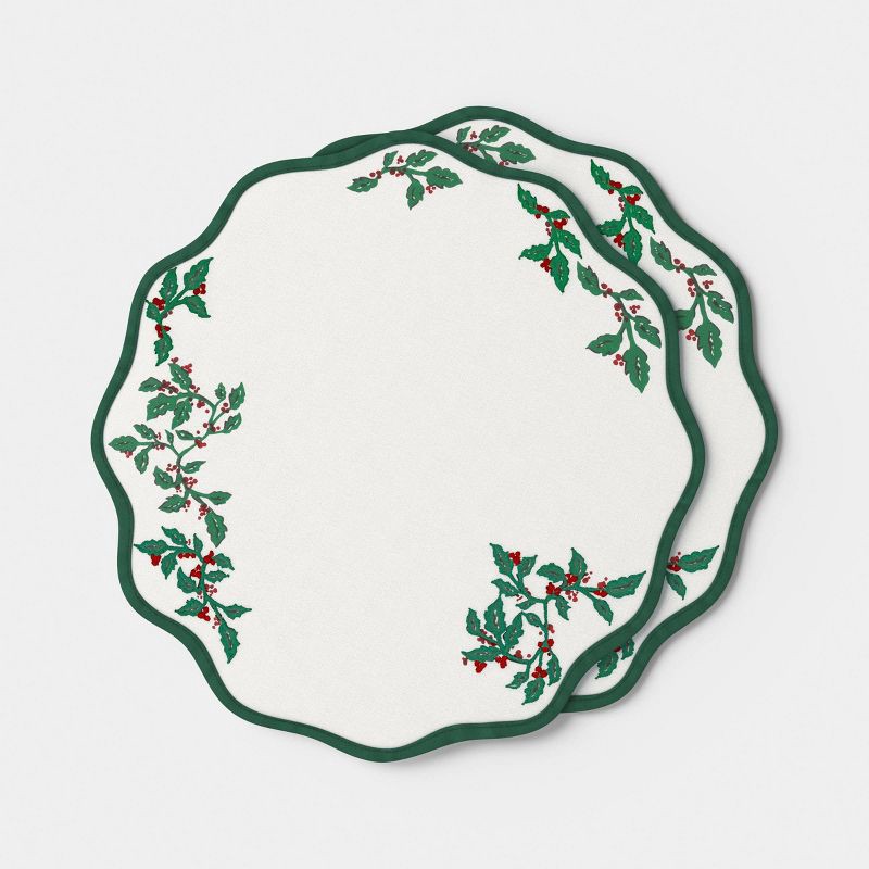 Dress your dining table for holiday gatherings with these 2-Pack Scallop with Embroidery Chargers from Threshold™. Made of cotton-linen blend fabric for a soft feel, these scalloped chargers feature e…