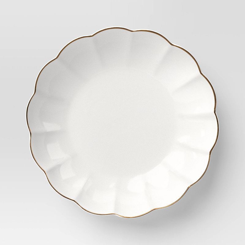 Make your dishes look extra tempting by serving in this Scalloped Dinner Bowl from Threshold™. Made of stoneware, this white serving bowl features a scalloped edge and is accentuated by a gold-tone ri…