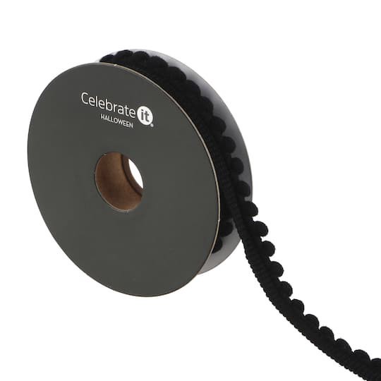 Buy this 3/8" x 3yd. Black Pom Pom Ribbon by Celebrate It Halloween at Michaels. Featuring a soft black pom pom design, this thin ribbon is perfect to add a touch of Halloween fun to costumes, treat b…