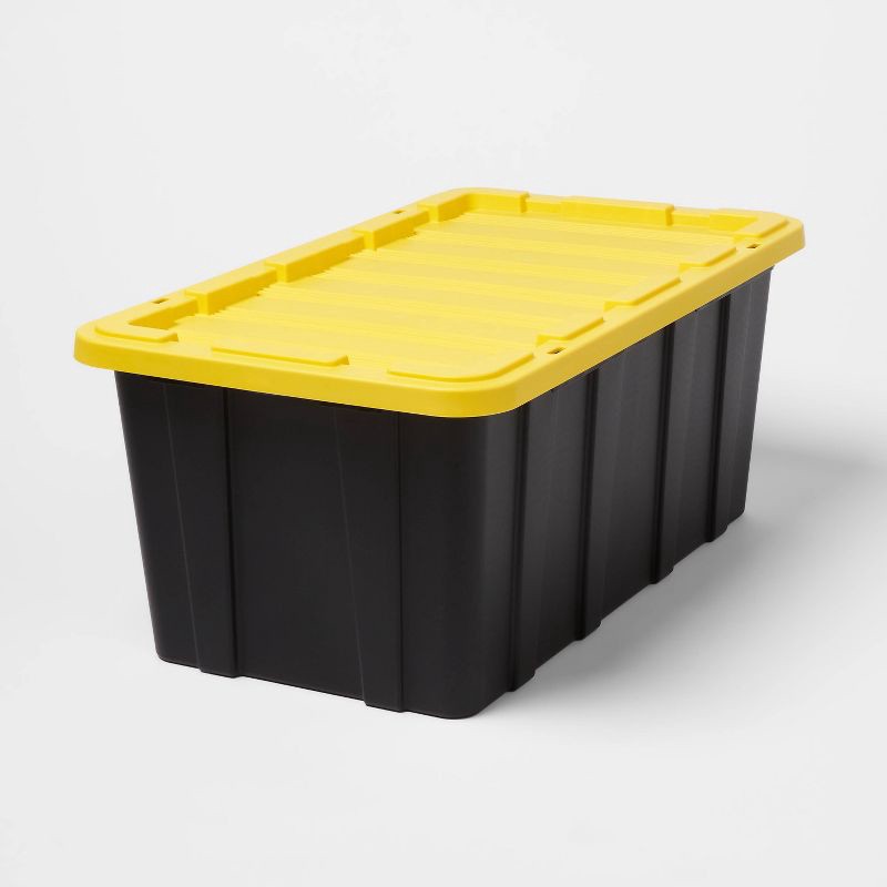 Keep your garage or gardening tools organized in one spot with the Heavy Duty Storage Tote from Brightroom™. This black storage tote is designed in a rectangular shape with a yellow lid for a contrast…