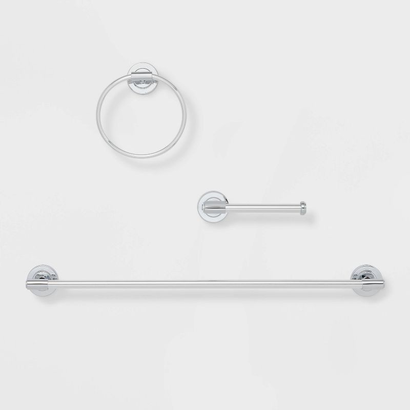 - 3-piece bathroom set: 24-inch towel, towel ring, and bathroom tissue holder.