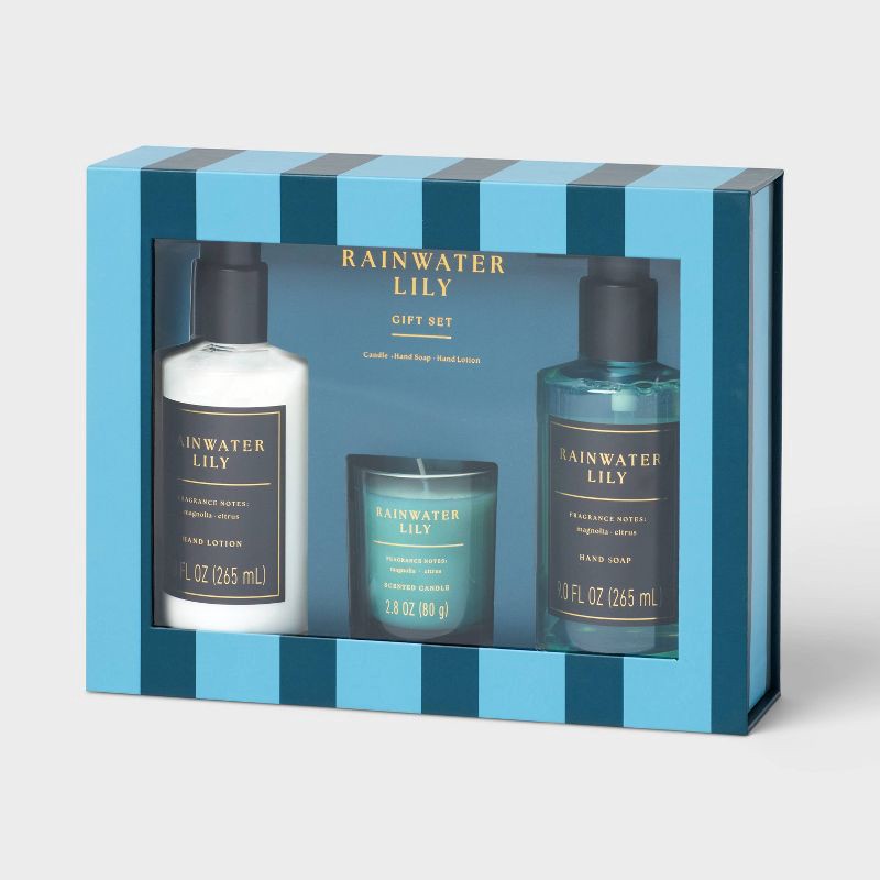 Treat yourself or someone special to everyday luxury with the 3pc Personal Care Hand Soap and Lotion Candle Gift Set from Threshold™. This beautifully curated set includes a scented hand soap, moistur…