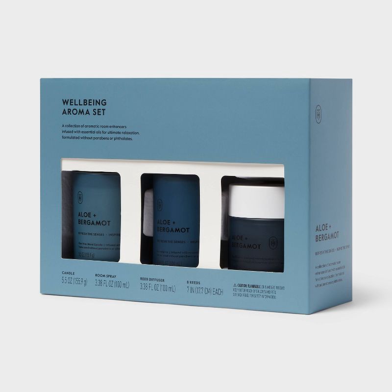 Create a soothing ambiance with the 3pc Room Spray and Diffuser with Aloe and Bergamot Candle Gift Set from Threshold™. This set includes a room spray, a reed diffuser and a scented candle with a 20-h…